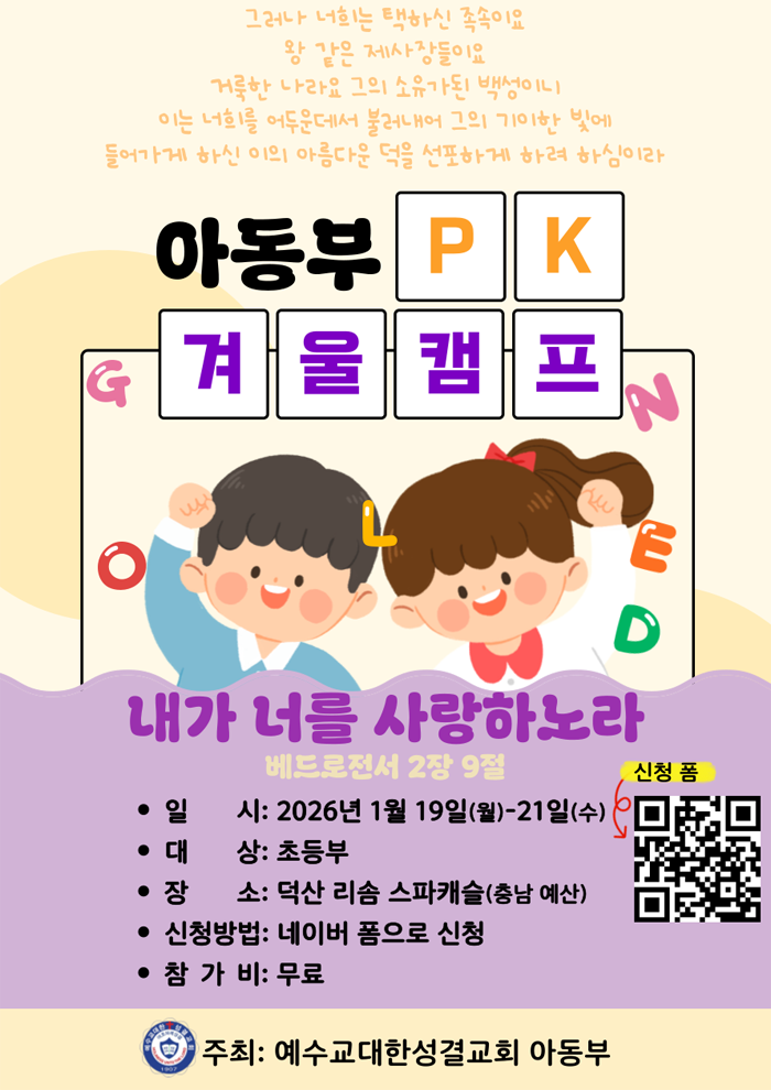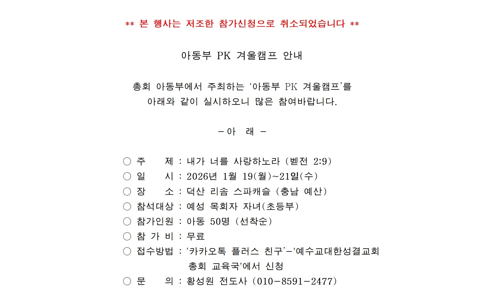 제목 아동부 PK 겨울캠프 안내 (**행사 취소**) 2025-12-19