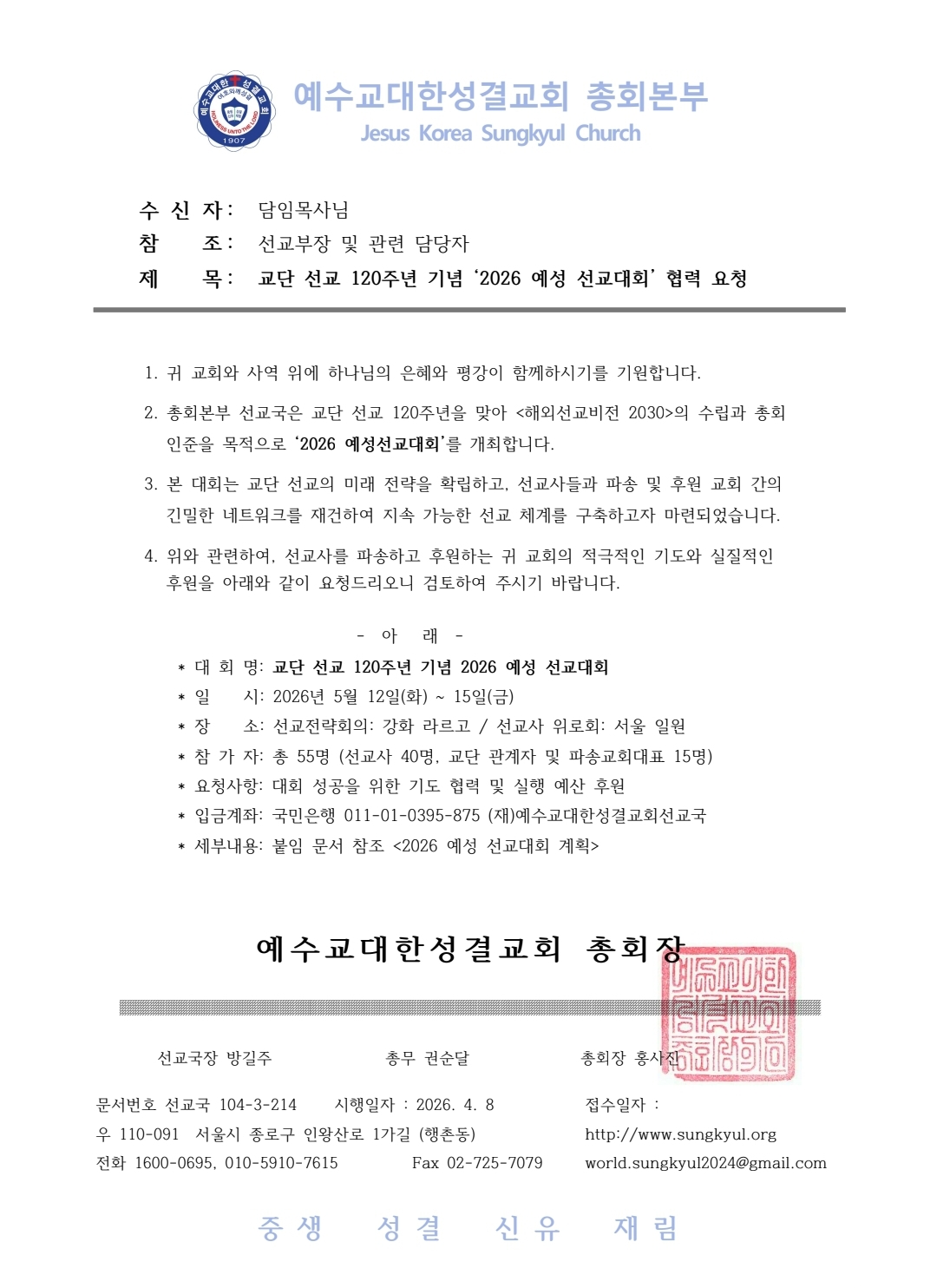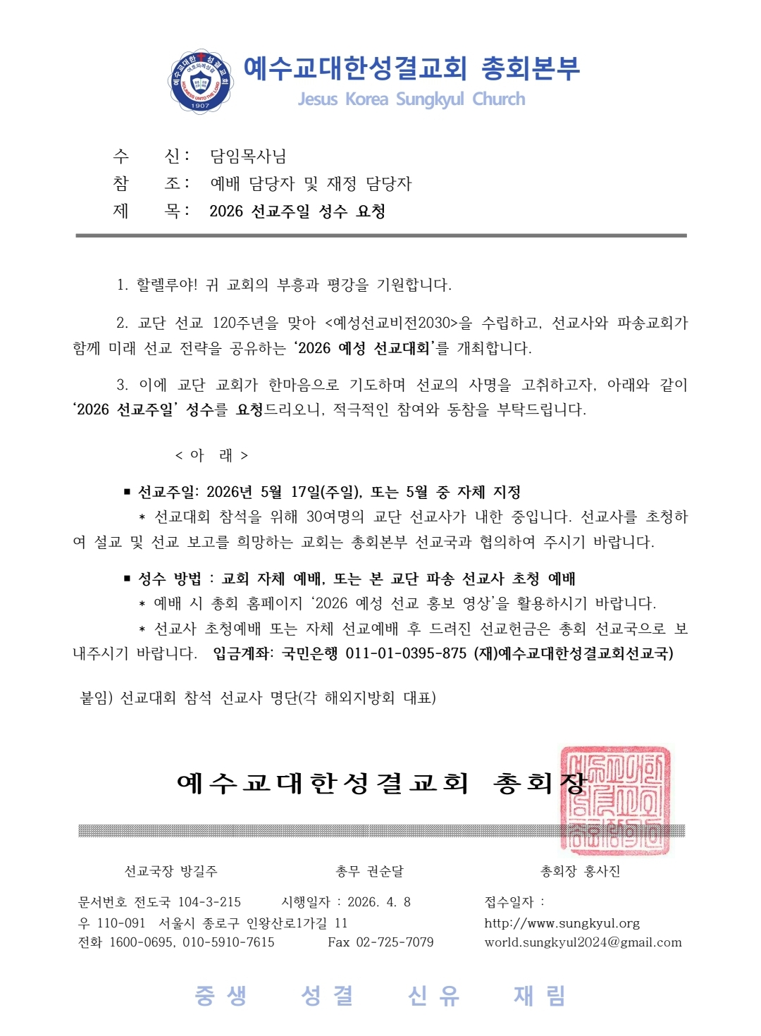 첨부파일 2026 선교대회 후원 요청 공문(전체).pdf | 2026 선교주일 성수 요청 공문(전체).pdf |