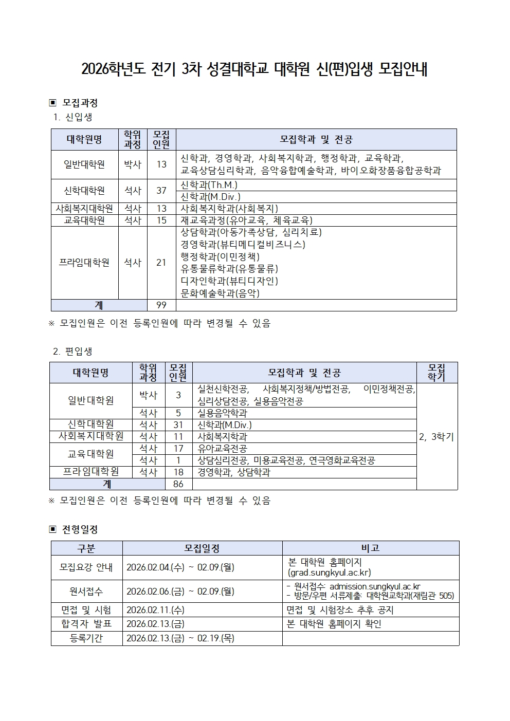 제목 2026학년도 전기 3차 성결대학교 대학원 모집 2026-02-05