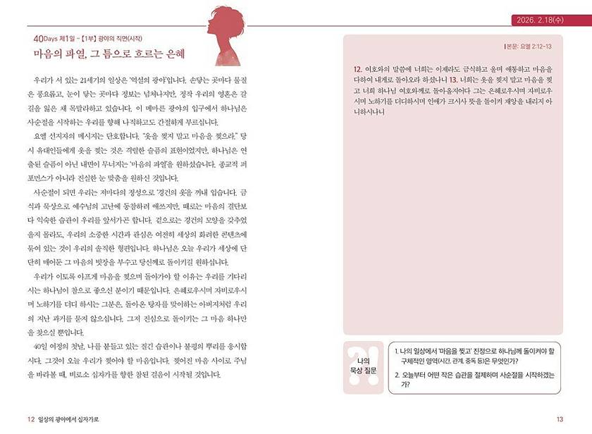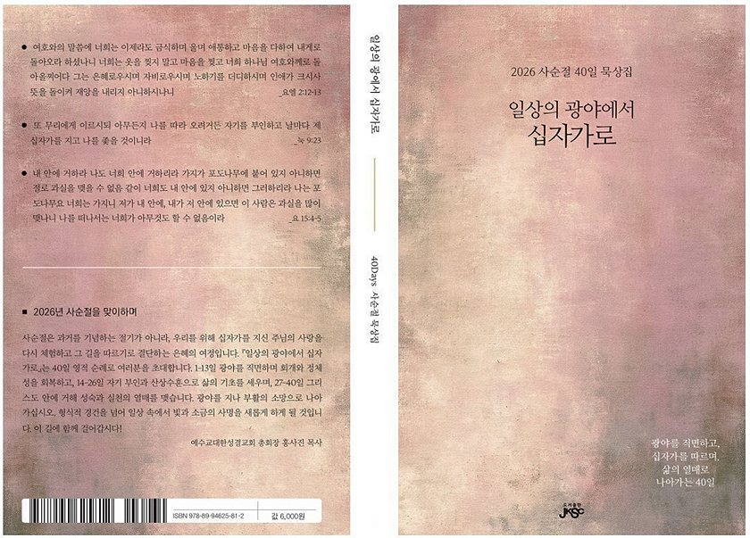 사순절은 과거의 절기를 기념하는 것을 넘어 십자가를 지신 주님의 사랑을 다시 체험하고, 그 길을 따르기로 결단하는 은혜의 여정입니다. 특히 2026년 사순절은 ‘묵상집’과 ‘필사집’을 구분하여 출판하였습니다. 본 서를 통해 은혜로운 사순절을 보내시기 바랍니다.